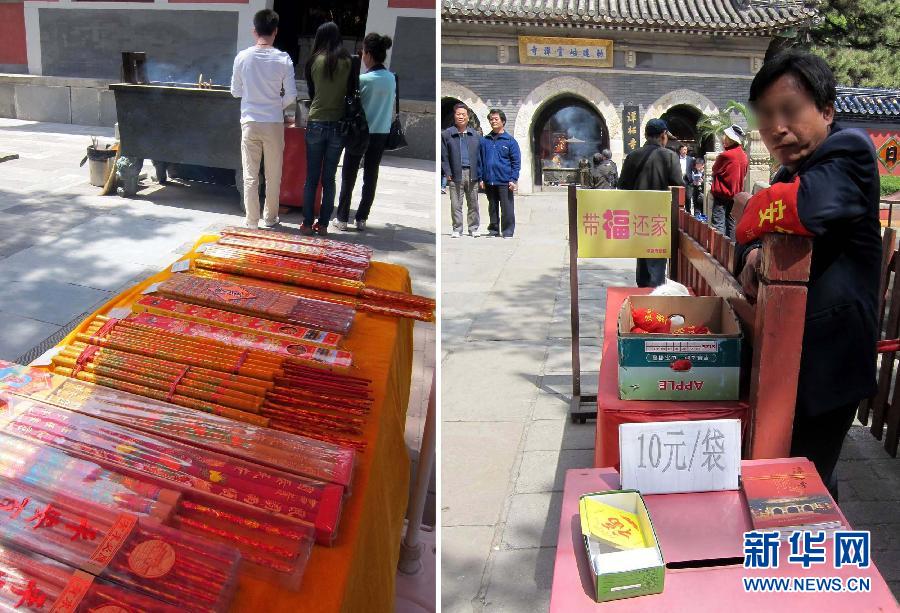 图为戒台寺内向游客出售的礼佛物品(左图)和潭柘寺入口向游客出售的“福袋”(拼版照片,4月26日摄)。春末夏初,北京西郊的戒台寺和潭柘寺凭借怡人的景色和悠久的历史吸引了众多游客和佛教信徒。然而,非国有资本控股公司——北京京西风光旅游开发股份有限公司2011年年报显示,两家寺庙与这家公司为“长期承包经营”关系。 “五一”小长假来临,国内相关信息显示,超过20个知名景区门票即将上调,涨幅均超过20%。与此同时,刚公布的多家旅游景区上市公司上年报显示,其景区主营业务利润率超过70%。各种数据表明,一些景区旅游上市公司,不仅无视公共资源的公众利益,同时也无视本公司的股东利益……一味地追求商业利润,受到各方意见批评。新华社记者 公磊 摄
