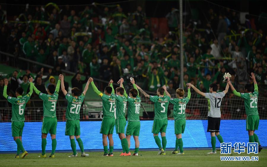 4月27日,北京国安队球员在获胜后向主场球迷致意。当日,在2012年中超联赛第八轮比赛中,北京国安队主场以1比0战胜上海申鑫队。新华社记者郭勇摄