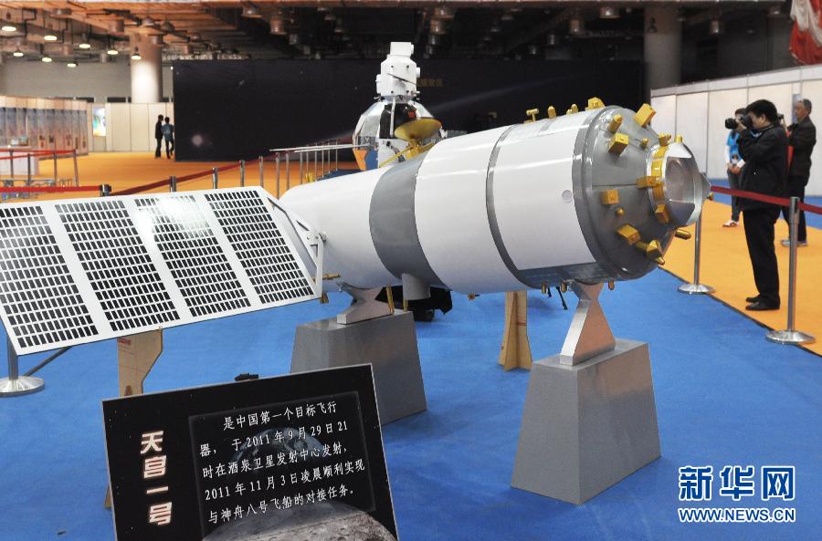 4月27日在中国航天圆梦科技展上拍摄的“天宫一号”目标飞行器。当日,中国航天圆梦科技展在济南高新区国际会展中心精彩亮相。此次航天科技展展览面积达4000平方米,展品覆盖星、箭、船、器各个宇航产品门类,集中展示了运载火箭发射模拟和神舟飞船返回舱等真实物品,展出规模空前。 新华社发(董乃德 摄)