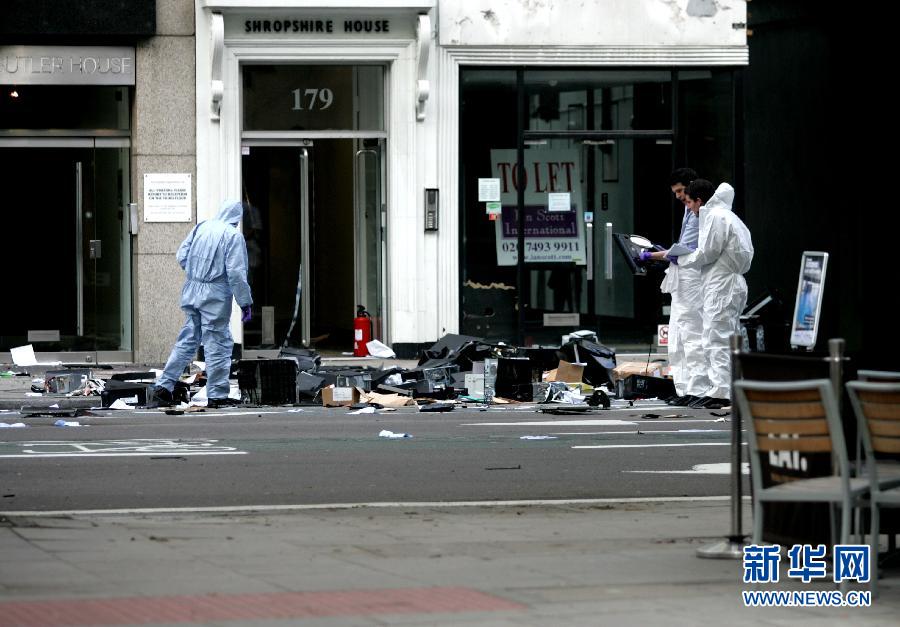 4月27日,在英国首都伦敦,相关专业人员清理案发现场。当日,一名男子闯入伦敦市中心一栋办公楼内闹事,从高处不断往外抛掷物品,警方被迫疏散附近民众并封锁整条街道。经过谈判专家的努力,该男子最终自首。新华社发(高塔姆摄)
