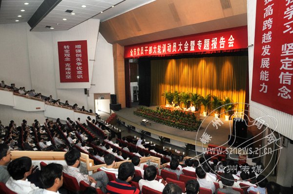 当天的动员大会后还举行了三场专题报告,省经信委副主任凌云、复旦大学教授童忠强、杭州市委党校教授霍团英分别就宏观经济形势与嵊州跨越发展、绩效评估和发展软环境建设和干部心理健康与调适三方面课题作了精彩的讲座。