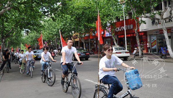 5月4日下午,嵊州宾馆团总支组织宾馆30多名青年团员开展了“绿色骑行,健康乐享”自行车环城游活动,倡导节能减排、绿色消费的绿色饭店理念,展现宾馆青年团员的风采。与此同时,嵊州宾馆团总支还组织部分青年团员前往文化广场,通过分发宣传单、现场讲解等方式,宣传绿色消费内容,倡导市民为环保事业献出一份力。图为青年团员开展绿色骑行活动。