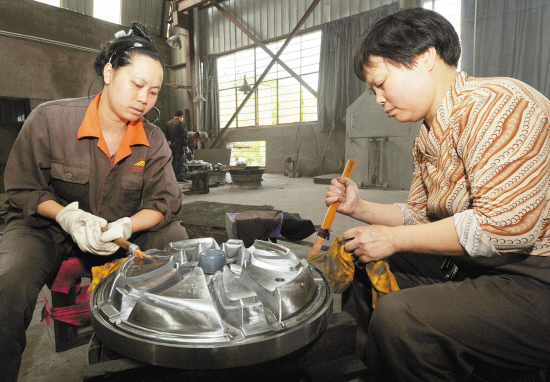 嵊州市永峰模具制造有限公司以科技为依托,已成长为国内轮毂模具研发实力最强的三家企业之一。图为该公司员工正在对最新研发的轮毂模具进行人工除刺。【来源:天天商报】