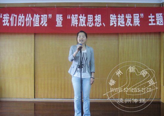 5月7日下午,剡湖街道举行“我们的价值观”暨“解放思想、跨越发展”主题演讲比赛,参加比赛的选手以饱满的热情阐述了自己的价值观及对解放思想、跨越发展的认识。图为选手正在比赛中。