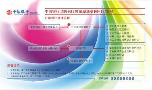 2、客户申请ETC业务(如客户已持有中信卡):客户持本人有效身份证件、本人中信银行信用卡、拟签约车辆行驶证(可为非本人车辆)至中信银行绍兴分行所有网点申请车牌信息和信用卡的绑定,并在现场办理ETC电子标签安装。