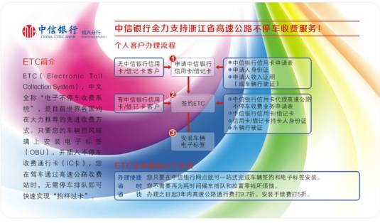 1、客户申请信用卡或借记卡(如客户未持有中信卡):客户凭本人身份证、行驶证等相关证件资料,可向中信银行各网点申办信用卡,中信银行绍兴分行已开辟ETC进件绿色通道,加快发卡速度和提高核卡率。