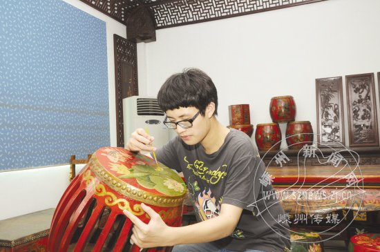 近日,市古艺木雕厂开发的一种民俗风情仿古家具,受到国内消费者的青睐。这种仿古家具加工后漆上红漆,再用描画的方式,将花卉、动物等图案绘在家具上,使其充满了民俗风情特色。图为工人正在对仿古家具进行描画。