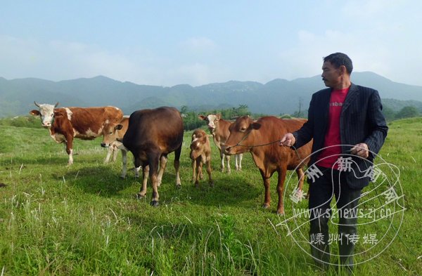 三界镇蒋镇村的龚根生,这些年利用山区草资源丰富的优势,每年饲养菜牛50多头,不仅丰富了菜市场,而且找到了一条致富之路。图为龚根生正赶着牛群放牧。
