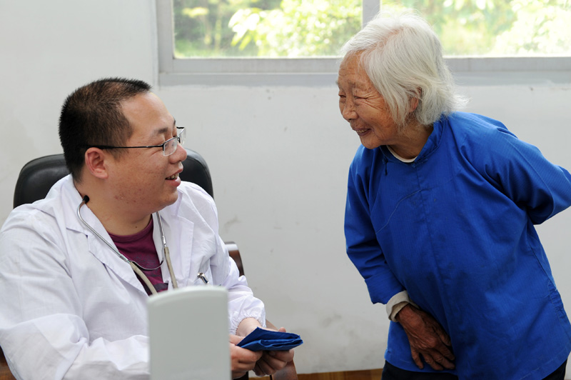 5月17日,贵门乡流岭村的99岁老人曹苏娟(右)在看完病之后向社区卫生服务中心的医生钱仲民表示感谢,还邀请他没事的时候到家里坐坐。