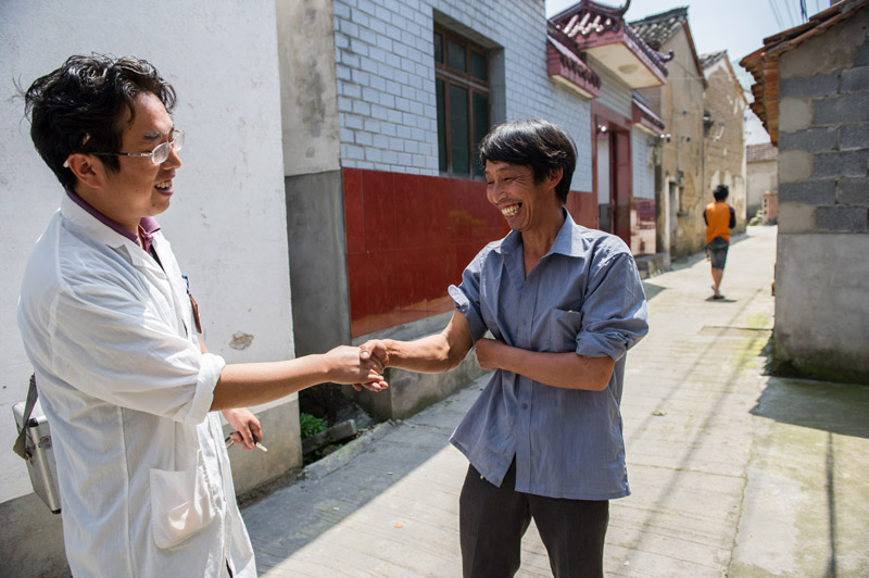 5月17日,贵门乡社区卫生服务中心的医生王宇(左)在为贵门乡前王村的村民诊疗结束后,村民的亲属与他握手道别。