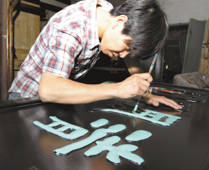 仿古木雕产业是嵊州市重要的文化产业之一,该产业目前正谋求着新的转型升级。记者日前在采访时发现,文化底蕴深厚、做工考究、材质上乘的牌匾、楹联、抱联制作,在仿古木雕产业中成为后起之秀。据相关人士介绍,生产牌匾等仿古木雕制品,利润是普通仿古家具的两倍。图为昨日黄泽镇某仿古木雕家具厂的工人正在制作牌匾。