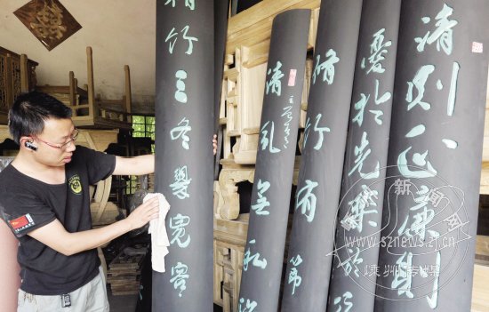 仿古木雕产业是我市重要的文化产业之一,日前正在谋求新的转型升级,由制作仿古家具向牌匾、楹联、抱柱对联发展。据相关人士介绍,我市产的牌匾因质量、做工优而广受市场好评,利润也比普通仿古家具高。图为黄泽镇一仿古木雕家具厂工人正在对已加工完的抱柱对联作出厂检查。