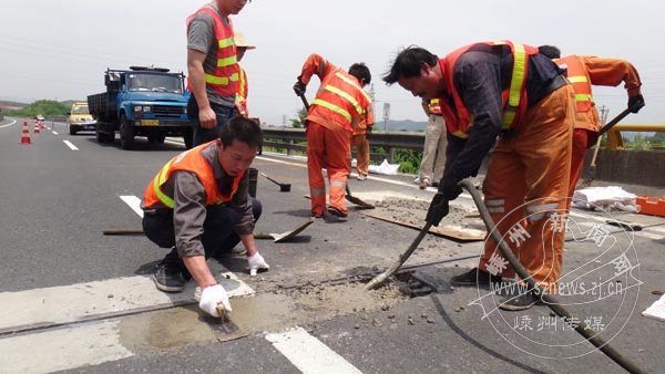 日前,上三高速公路绍兴管理处采用超快硬混凝土修复王,对上三高速公路三界大桥左幅局部破损伸缩缝进行修补,15分钟后开始初凝,90分钟后即可通车,不需像以前那样用高标号水泥混凝土修复,需要24个小时才可放开通行。这种新工艺修复法,质量稳定,耐久性强,大大提高了工作效率。