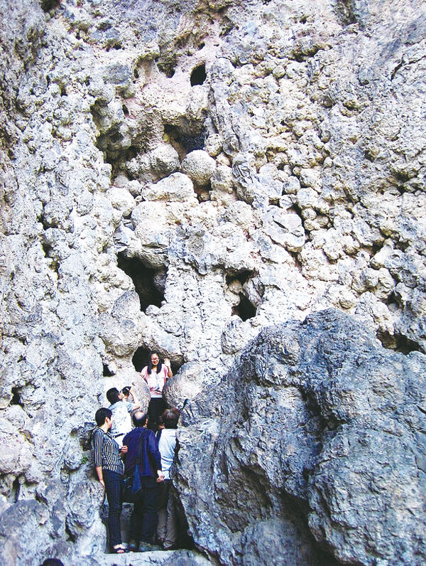 迂回曲折,我们费了好大劲,攀援上步虚山顶部的火山口——凌虚洞。这就是我们要探秘的那个神奇的火山口了。进入喉管通道内,远看如蚁巢状的洞穴,近看如蛋窝,全部由大小不一的熔岩球叠加而成,坚硬似铁,油黑发亮,其重异常,具有极高的科学研究价值。