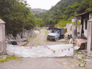前天下午,记者特地去三单乡现场查看。车过位于嵊州市贵门乡境内的丰潭水库,便很快达到东阳市三单乡境内。车沿着怀万线行驶没几分钟,第一个青石加工企业便呈现在记者眼前。这里显然已被废弃,没有工人,听不到机器的轰鸣声,场地里堆放着不少青石板。几年前,记者曾到过此地,那时这里非常热闹,完全是另一番景象。