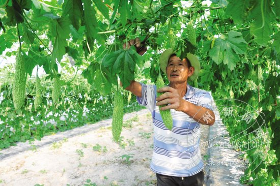 为帮助引导更多农民致富,丰富市民菜篮子,市良种繁育场今年试种了多只苦瓜新品种,目前已开始陆续上市。苦瓜因其清热解毒、清肝明目等功能被称为暑季佳蔬,由于本地无公害苦瓜在市场上求大于供,使苦瓜成为市场“香饽饽”。图为昨日正在采摘苦瓜的场景。