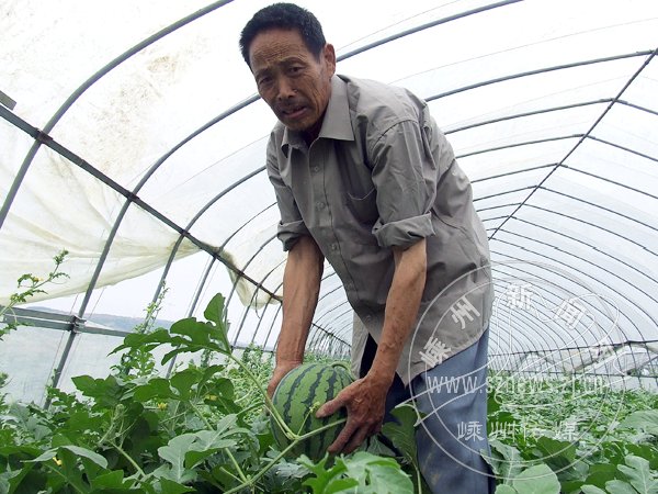 这几天,黄泽早西瓜上市啦,价格在每公斤6元左右。进入5月以来,由于气温适宜,今年的早西瓜品质较好。图为黄泽镇普安村胡宅自然村瓜农正在地里查看西瓜长势情况。