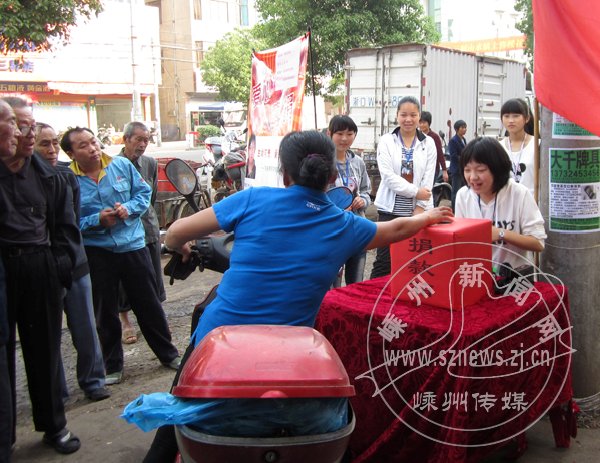 5月17日一大早,三界镇中学的共青团员志愿者就来到该镇农贸市场门口,为身患重病而缺钱医治的该校学生张燕开展募捐活动。