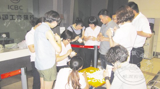 中国工商银行嵊州支行为提高窗口服务水平,临柜员工利用休息时间用心苦练内功。图为金融系统保持十年的点钞冠军吴竞竞,给年轻的新员工们面授点钞技巧。