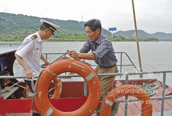 昨日,我市地方海事处针对汛期江面航运客运安全进行突击检查,特别是对曹娥江上5艘客渡船要求船主对旧的救生装备进行更换,确保航运安全。据悉,该处通过安全严查,积极消除隐患,渡口连续30余年没有发生安全事故,确保了群众乘渡安全。图为市地方海事处的执法人员正在检查救生装备的现场。