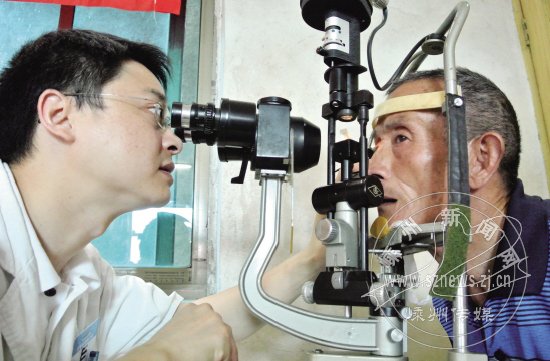 昨日,市人民医院的党员志愿者来到三界镇南街村,为当地农村百位老党员和老年人开展“爱眼日”义诊活动。图为志愿者正在为老人义诊的现场。