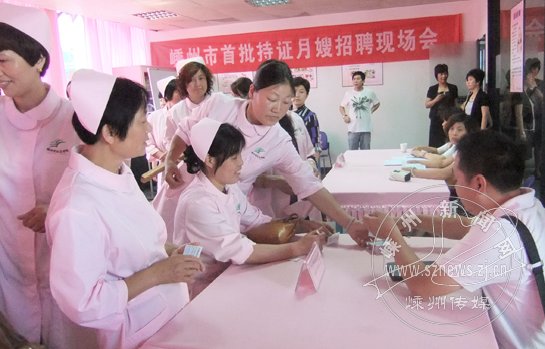 据悉,该“月嫂”培训班由市农转办、市人力社保局与市区职工农民培训中心联合举办,也是我市第一次开办专业的“月嫂”培训。在随后举行的我市首批持证“月嫂”招聘现场会上,31名“月嫂”被来自宁波及我市市区七家家政服务公司“抢购”。图为招聘现场。