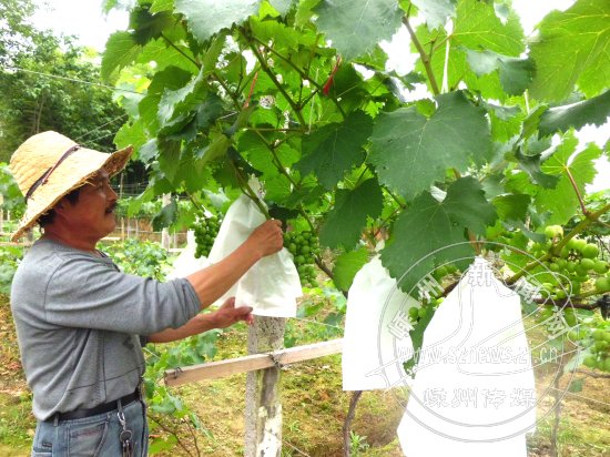这几天,三界镇大龚村种植大户龚春尧一家早出晚归,忙着为一串串的葡萄穿“衣”。葡萄穿“衣”是提高品质和产量的一项新措施。龚春尧告诉记者,葡萄通过套袋减少了用药的次数,既能够避免虫子叮咬和鸟类来啄食,还能卖个好价钱。