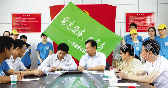 记者在“承诺书”上看到,沿江造纸企业签下的承诺内容有坚决杜绝在曹娥江边倾倒、抛弃、堆放污染物以及排放污水等行为,坚决做到不私设暗管偷排污染物等等内容。图为企业主(左)与市环保局签订“保护曹娥江承诺书”。