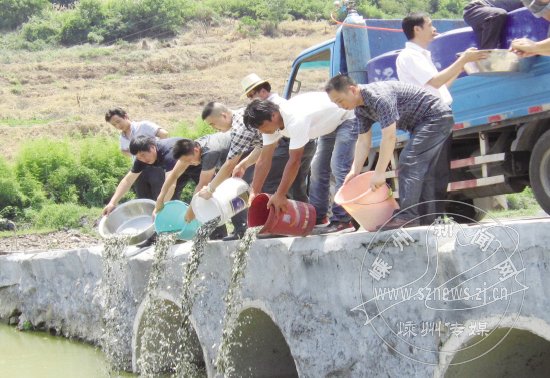 为保护渔业资源稳定,保持黄泽江、长乐江水质清洁,7月3日,市渔政站在黄泽江和长乐江开展了2012年度夏季鱼类资源增殖活动,共放流各种夏化鱼种300万尾,其中白鲢150万尾,花鲢100万尾,草鱼50万尾。图为在黄泽江前良村江段放流的现场。