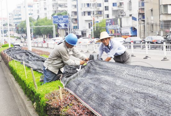 这几天持续晴热高温,市园林管理处工作人员为一些绿化带中不耐高温干旱的花草、小树“穿”上遮阳衣,以免被烈日烤干。图为昨日上午,园林养护工人在为嵊州大桥两侧绿化带的花草盖上遮阳网。