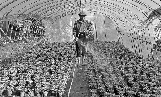 嵊州市园林管理处的盆栽鲜花培育基地里,在园林工人精心呵护下,鸡冠花等上万盆各式鲜花长势旺盛。这种自己培育的鲜花,适应性强,成活率高,为该市园林管理处美化嵊州城区街道提供了保证。图为昨日园林工人正在给花苗浇水。 【来源:天天商报】