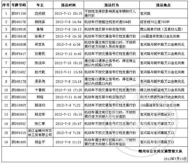 下列机动车和驾驶人因有交通违法行为被交警查处,现予以曝光: