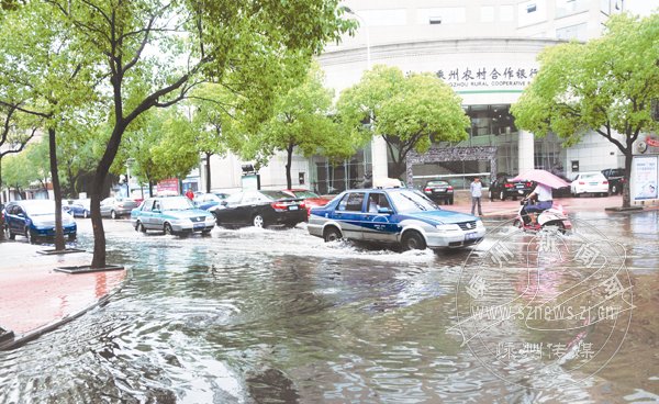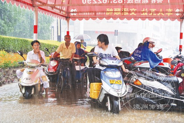 昨日下午的一场雷阵雨,造成市区部分路段严重积水,某些地段水深更达30多厘米。车辆驶过,溅起阵阵浪花。上图为记者在官河路越秀路口拍摄到的场景,下图为避雨的市民。