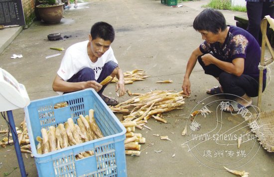 前几日持续高温干旱天气,使山区无公害鞭笋身价倍增,每公斤收购价格高达18元。昨日,记者从海拔500多米的崇仁镇高湖头村了解到,虽然今年该村毛竹基地的鞭笋产量有所下降,但农民的收入依然不减,平均亩收入可达2000元左右。图为绍兴一收购商正在高湖头村收购鞭笋。