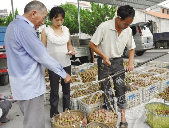 金庭镇桃形李已开始采摘,由于科学管理,今年的桃形李品质好,味道甜,各地客商纷至沓来,收购价中小李每公斤3元至6元,大李每公斤在12至20元之间。据了解,今年金庭桃形李总面积达到了1.5万亩,已经投产的有1.2万亩,预计产量可超1800万公斤。图为灵鹅村桃形李收购点一角。