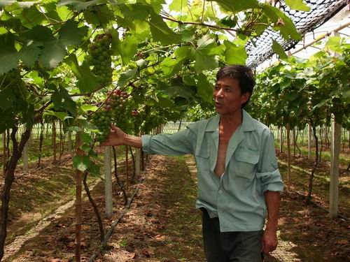 所谓的避雨栽培技术就是在葡萄的生长季节,在其葡萄顶上,搭架覆盖塑料薄膜,下雨时使水顺膜流下不落在叶蔓、果上。这样一来降低园中土壤水分和空气湿度,为喜干燥气候的葡萄湿度降低后,不利于病菌繁殖,可有效地减轻黑痘病、灰霉病、炭疽病、白腐病、霜霉病等的发生和危害,无病或少病后还可大大减少喷药次数和用药量,既有利于生产无公害葡萄,又可节约农药、人工,降低生产成本,稳定产量,提高收入,一般每亩可比露地栽培增收600至1000元以上,而塑料薄膜的成本相对较低,只要每亩约花300元左右。尹仲庚接着又说:“前二年我们主要是不懂,其实这点成本也不高,现在,我们在农技部门的指导下,再加自己的实践,掌握了这门技术,所以今年见效了。”是的,从仲庚师傅这句话里,让我再次深深地体会到,科技就是生产力,同样的土地,同样的葡萄树,采用了不同的方法栽培,其效果就是不同,从中也更让人认识到,希望的田野更需要一代学科学、懂技术的新一代,让有限的土地增效,让农村、农民致富。