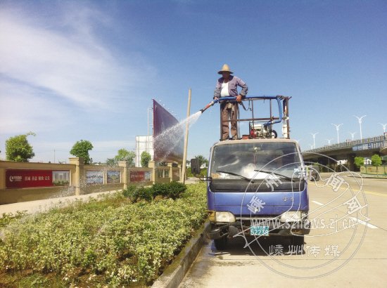 连续的高温晴热天气,让草木也喊渴。据园林工人介绍,为保护苗木,浇水须在上午9点之前或晚上5点之后进行,当天一早,他们就出动多辆水车,对开发区绿地、行道树等进行浇水养护。图为园林工人浇水护绿的场面。
