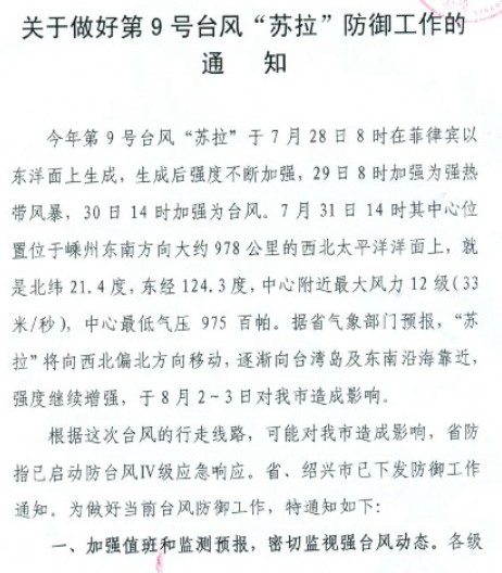 关于做好第9号台风“苏拉”防御工作的通知