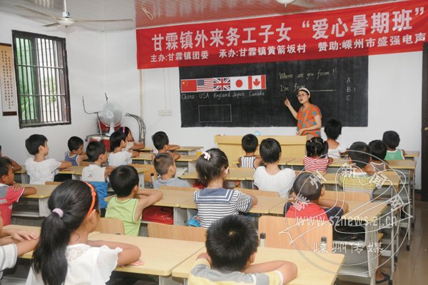 黄箭坂村外来务工人员子女爱心暑期班由甘霖镇团委主办,该村9—13岁的36名外来务工人员子女参加,由甘霖镇大学生村官和青年志愿者组成的“爱心教师”任教。