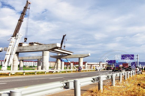 昨日下午,104国道嵊州段7标圳塍分离式立交桥首块梁板由中天路桥集团成功架设。该大桥为104国道连接嵊州市和新昌县最主要的公路桥梁,全长616.58米,首块梁板架设,在大桥右幅21-22号桥墩拉开序幕。图为施工人员操作两台大型吊机,将长20米,重44吨的首块梁板架上桥台。