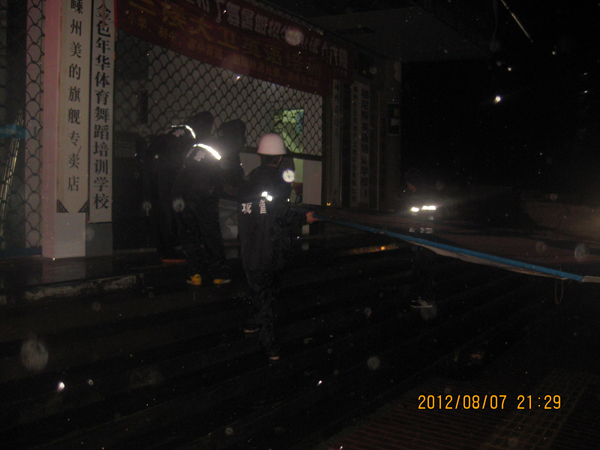 城管工作人员冒雨连夜拆除被台风吹坏的广告牌