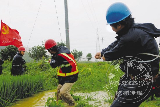 强台风“海葵”正面袭击我市,给我市的电力设施造成很大破坏,有7条10千伏线路跳闸,42个村、53个台区、6313用户遭遇停电。灾害面前市供电局党员突击队先后派出了25支党员服务队,奔赴各受灾点抢修,在纵横上百公里供电线路上,飘扬起了党员服务队鲜艳的红旗。图为昨日该局党员突击队员正在甘霖镇苍岩片抢修作业的现场。