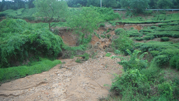 水口庵张小兴的养猪场,因为地势较低,早已经是“水漫金山”。一个在他家避雨的村民,看到汹涌的流水都不敢出来,足足被困了2个多小时。张小兴告诉通讯员,他的猪圈严重浸水,大猪、小猪都泡在“水牢”里,达两三个小时,还因为停电,无法给猪喂食。村民吕小良家住在地势很低的村口,这几天正在加工茶叶,如注的流水,全部往他的家里灌,他家的堂屋里浸水了,一家三口都忙着扫水。刚刚剪回来的3000多斤茶叶全部泡在水里。由于电力的中断,又无法及时加工茶叶。吕小良满脸忧色:如果过两天,还不来电的话,我的茶叶可就要发霉腐烂报废了。住在吕小良隔壁的村民吕孝勇,家里也办着茶厂,倾盆大雨的袭击,湍急的水流,把他家堆放在门口的煤块冲走了一大半。“我剩下了两吨多煤块,被雨冲走了一半多,损失有1000多元呢”。村民朱斌炎,今年在“坑底”种植了0.5亩的香料烟,眼下,正是烟叶收获的季节。两个多小时的暴雨,把他家烟地的一部分沦为乱石成堆的废墟,幸存的烟杆也是东倒西歪、一片狼藉,许多烟杆上还沾满了泥浆。他的妻子兰珍说:“穿烟叶之前,我还得把青叶洗一遍才好,否则的话,烟叶就没有办法卖出去。”这场罕见的雷雨,还使很多农户的茶园,发生大面积塌方,吕学兴在屋基山的茶园就有0.5亩地方塌方;吕小良家大大小小的茶园塌方有十多处。“要想恢复原状,还真需要不少劳力和资金。”