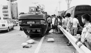 前天下午,嵊州城区景观大道艇湖村地段,一辆槽罐车与一辆小轿车在行驶中发生刮擦,一声巨响后,小轿车四轮朝天翻转在路上,车上人员从车窗爬出后,被及时送医救治。【来源:天天商报】