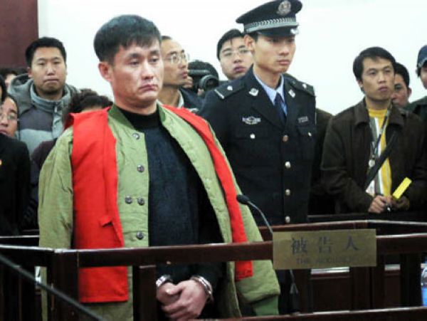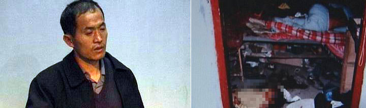 杨新海,1970年出生,高中肄业,原籍河南省正阳县。高三时离家出走之后,杨曾先后到过山西、河北等地,在一些煤矿、建筑队上打工,期间因盗窃、强奸被2次劳教,1次判刑。从2000年9月起直至2003年8月,杨新海曾横跨皖豫鲁冀4省,疯狂作案26起,杀死67人,伤10人,强奸23人。左为杨新海受审,右为杨新海犯罪现场。