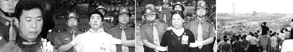 2000年12月9日,张书海、张宏超、张世镜、乔红军、张玉萍按照事先预谋和分工,分别携带铁锤、猎枪等作案工具窜至郑州广发银行银基营业部大厅内,采用引爆爆炸装置、铁锤砸玻璃,开枪威吓保安及客户等手段,抢走营业款人民币208万元。2001年9月16日,张书海等6名主犯被判处死刑,并押赴刑场执行枪决。从左到右为:主犯张书海、主犯张宏超(张书海之子)、主犯张玉萍(张书海之妹)、6主犯被押赴刑场情景。