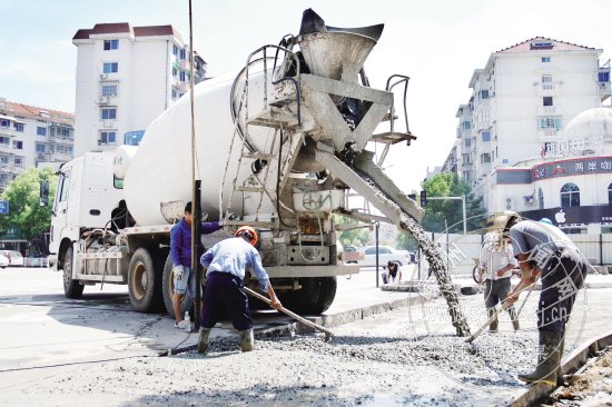 昨日上午,记者在官河路与城中路交叉路口的道路改造现场看到,施工人员正顶着烈日加紧施工。据了解,该路段以前经常发生拥堵,市政设施管理处投入106万元进行改造,除增加一个车道外,路口还将实行右转渠化,提高车辆的通行率。为保证9月1日鹿山小学开学前投入正常使用和不对环境造成污染,施工单位还选择了商品化混凝土进行路面浇筑。
