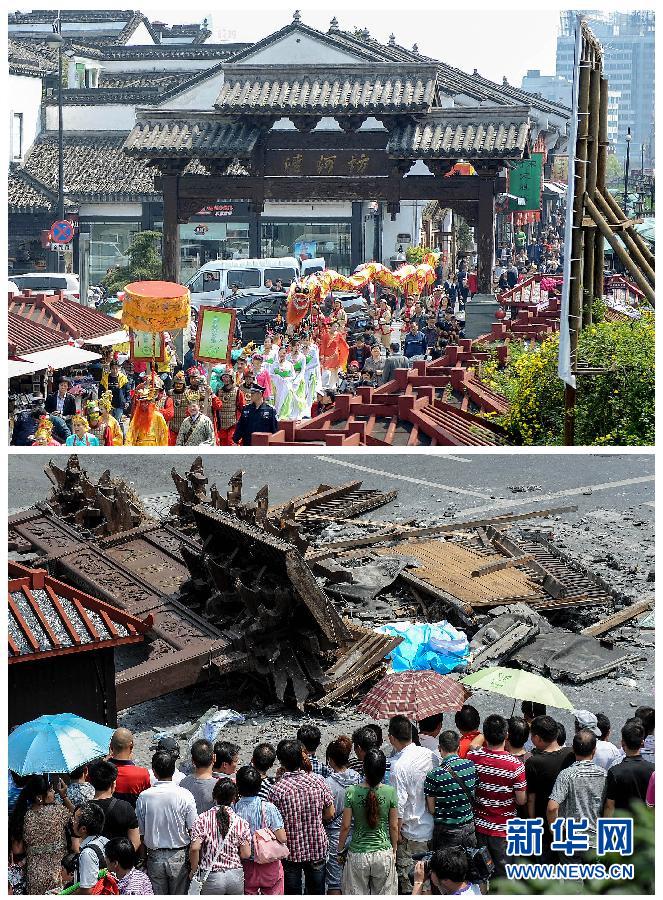 这是杭州河坊街牌坊倒塌前后的对比照片,上图摄于2012年4月6日,下图摄于2012年8月12日。 8月12日,位于原南宋皇城脚下的杭州市上城区河坊街口的牌坊突然倒塌,造成正经过该路段的2人死亡、1人受伤。记者14日从上城区政府了解到,地方党委政府高度重视,正在全力调查处置善后。一些市民和专家认为,必须警惕建筑物伤人的事件,强化相关部门的监管,减少“身边的危险”。新华社记者韩传号摄