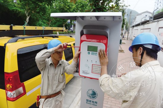 日前,我市首座电动汽车充电桩在市区艇湖路建设完成,这标志着我市电动汽车充换电服务网络建设迈出实质性步伐。预计到2015年,我市将在市区范围内建设2座纯电动汽车充放电站和12个充电桩,并建成嵊州智能配调中心。图为市供电局工人正在安装电动汽车充电桩。