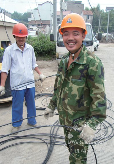 今年50岁的范孟生是电信局的一名老施工队员。上午11时的阳光显得格外刺眼,而满脸汗水的他正与队友徐海军在紧张工作中。范孟生哼着自己作词的歌曲,“海军前头拉,哥哥后面送……”以鼓动大家的工作热情,饱经风霜的脸在橘黄色工作帽下显得更加黝黑。范师傅告诉记者,每天5:40就从家里出发来上班了,越临近中午时分,就会感觉越疲惫,于是就会唱歌提提神。施工队队长叶国尧说:“我们的工作容不得丝毫的马虎,技术上必须保证。”